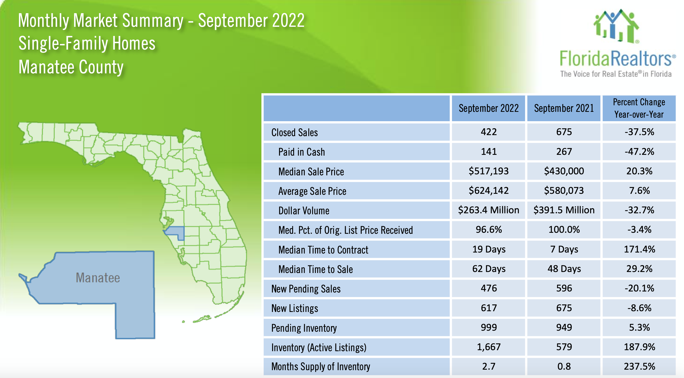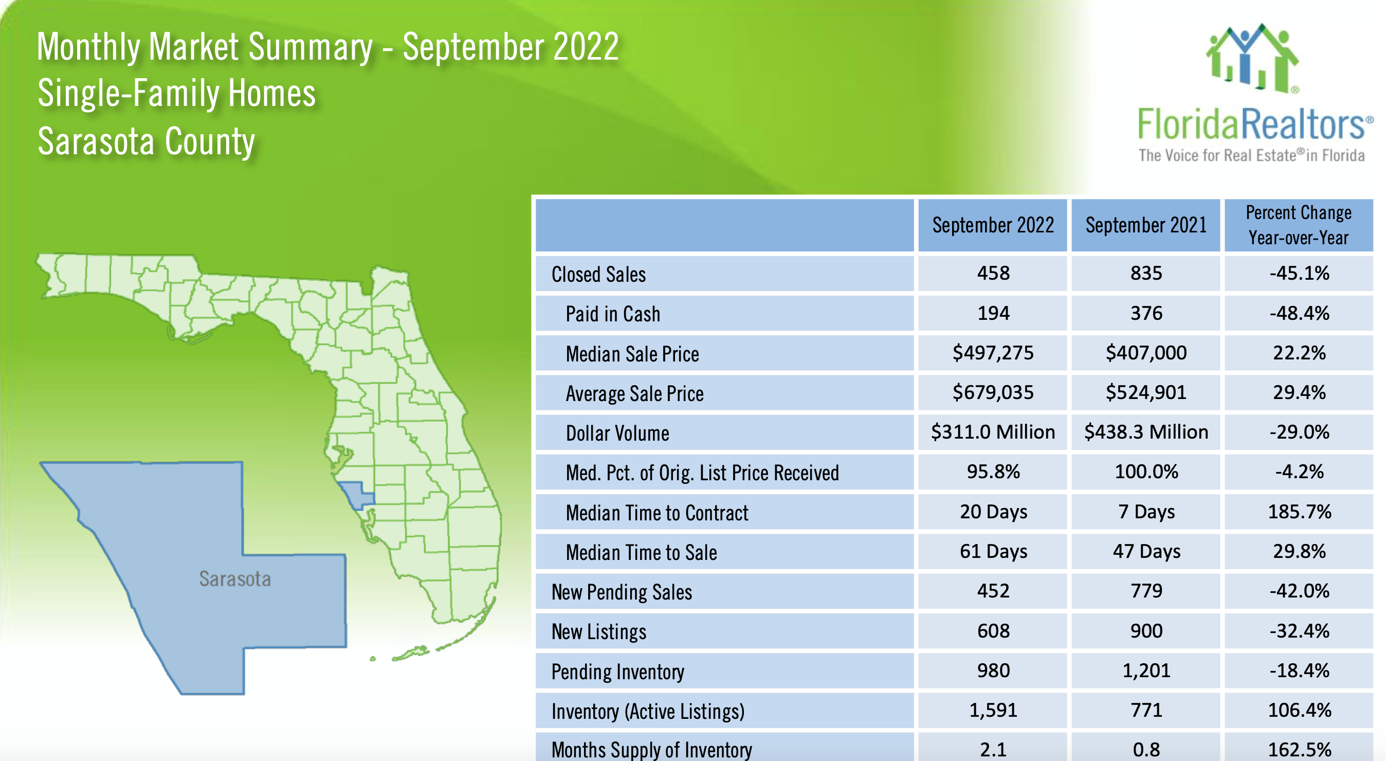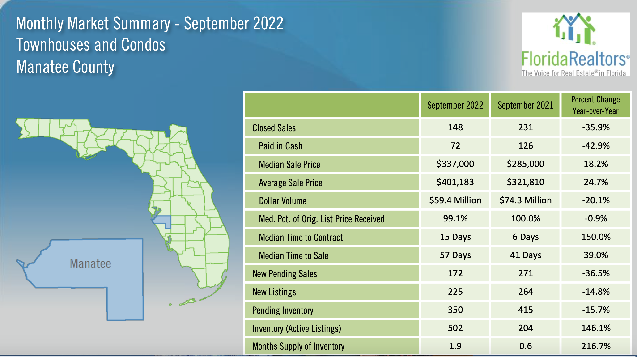 “As we’ve seen over the past few months, the trend of more for-sale inventory continued in September,” said 2022 Florida Realtors President Christina Pappas, vice president of the Keyes Family of Companies in Miami. “In time, more availability of supply will hopefully ease some of the challenges buyers currently face, such as rising interest rates and rising prices. While time to contract is lengthening, homes in Florida continue to go under contract quickly: The median time to contract for single-family existing homes in September was 22 days compared to 10 days during the same month a year ago. The median time to contract for existing condo-townhouse units was 21 days compared to 14 days in September 2021.