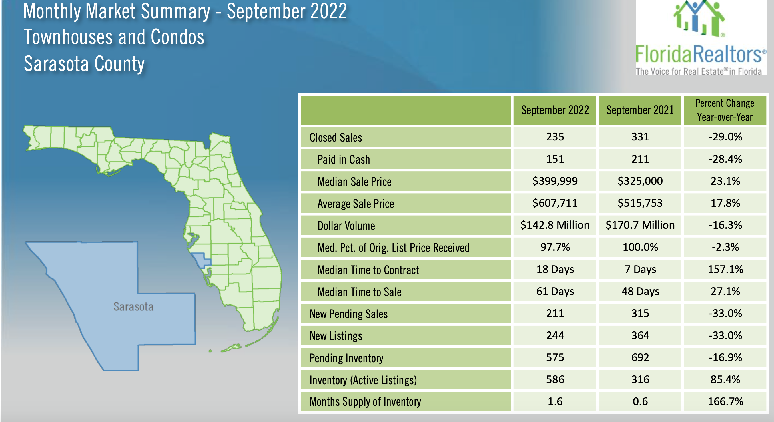 Closed sales of single-family homes statewide last month totaled 20,099, down 29% year-over-year, while existing condo-townhouse sales totaled 8,406, also down 29% over September 2021, according to data from Florida Realtors Research Department in partnership with local Realtor boards/associations. Closed sales may occur from 30- to 90-plus days after sales contracts are written.